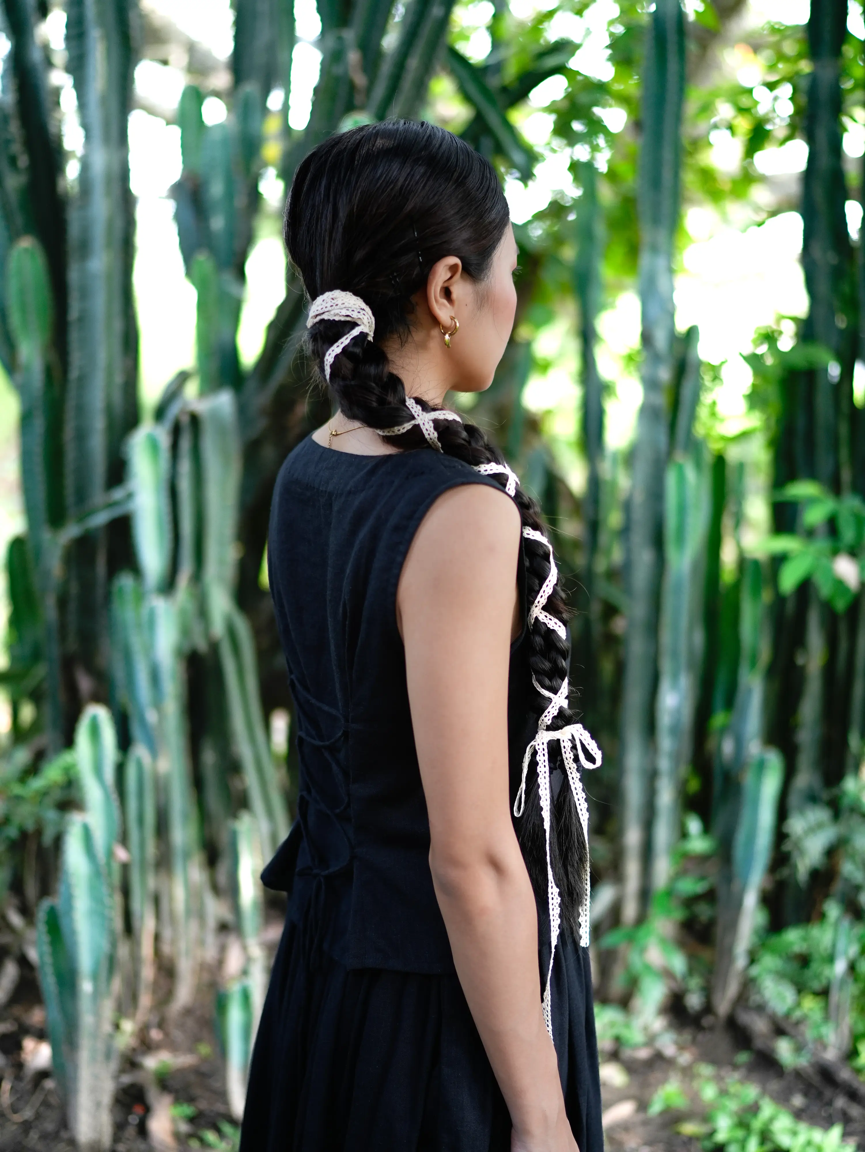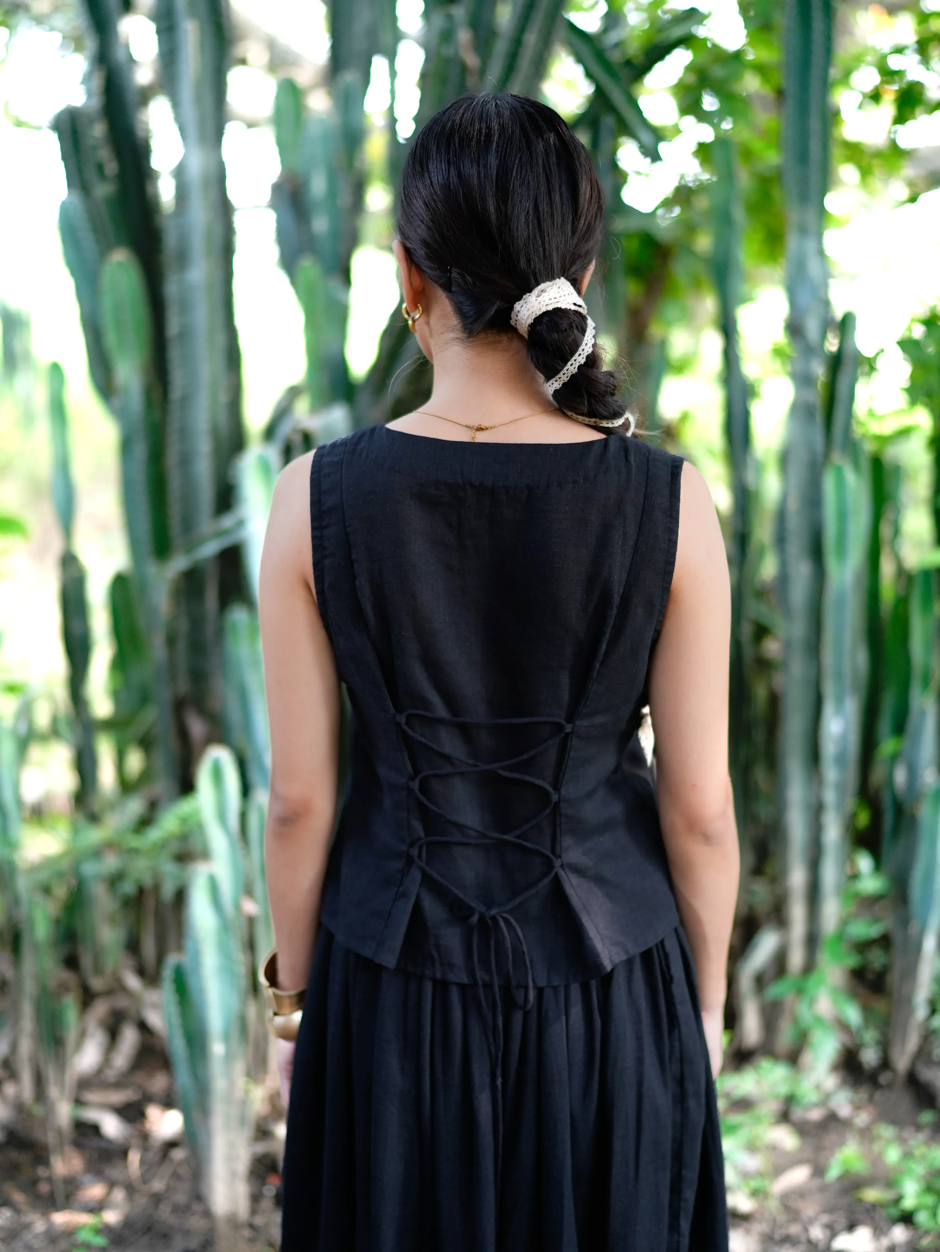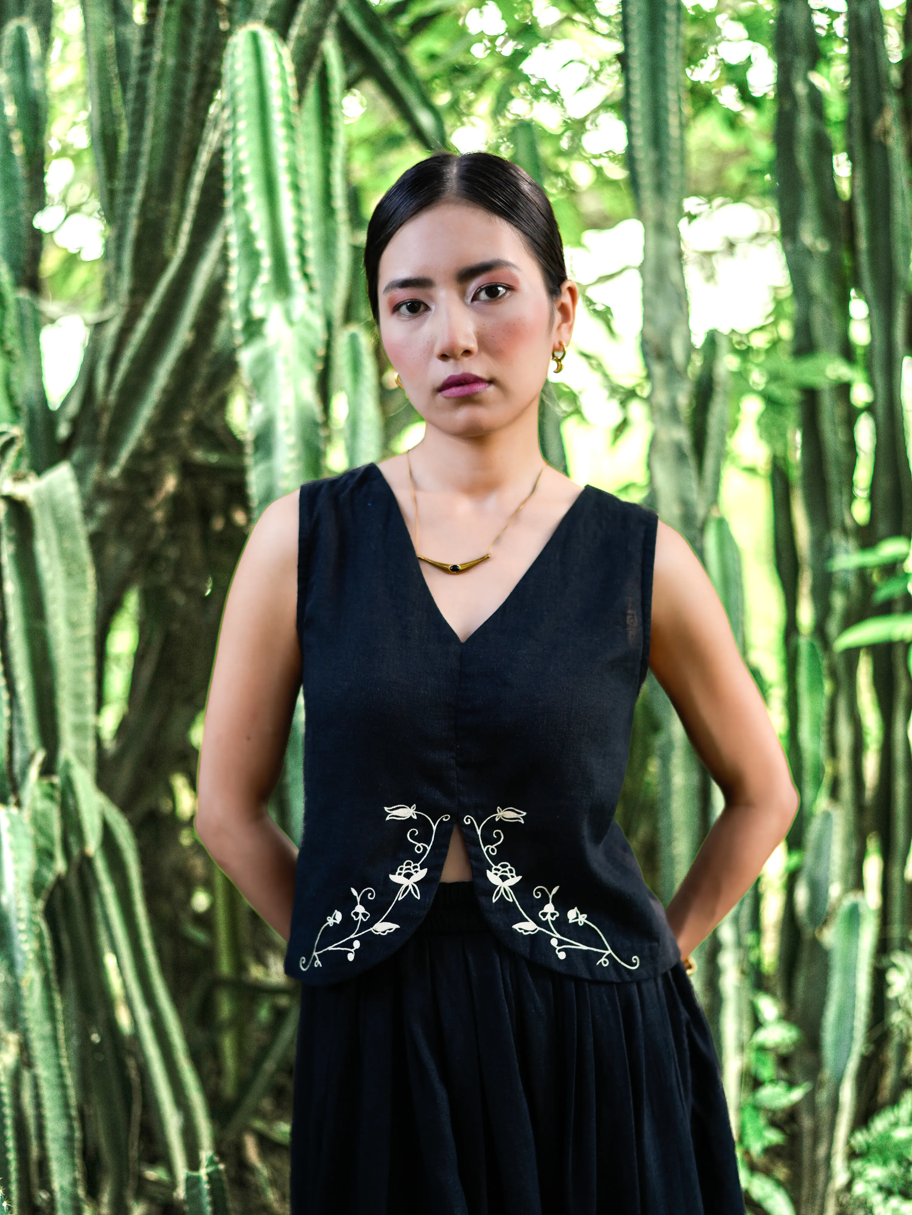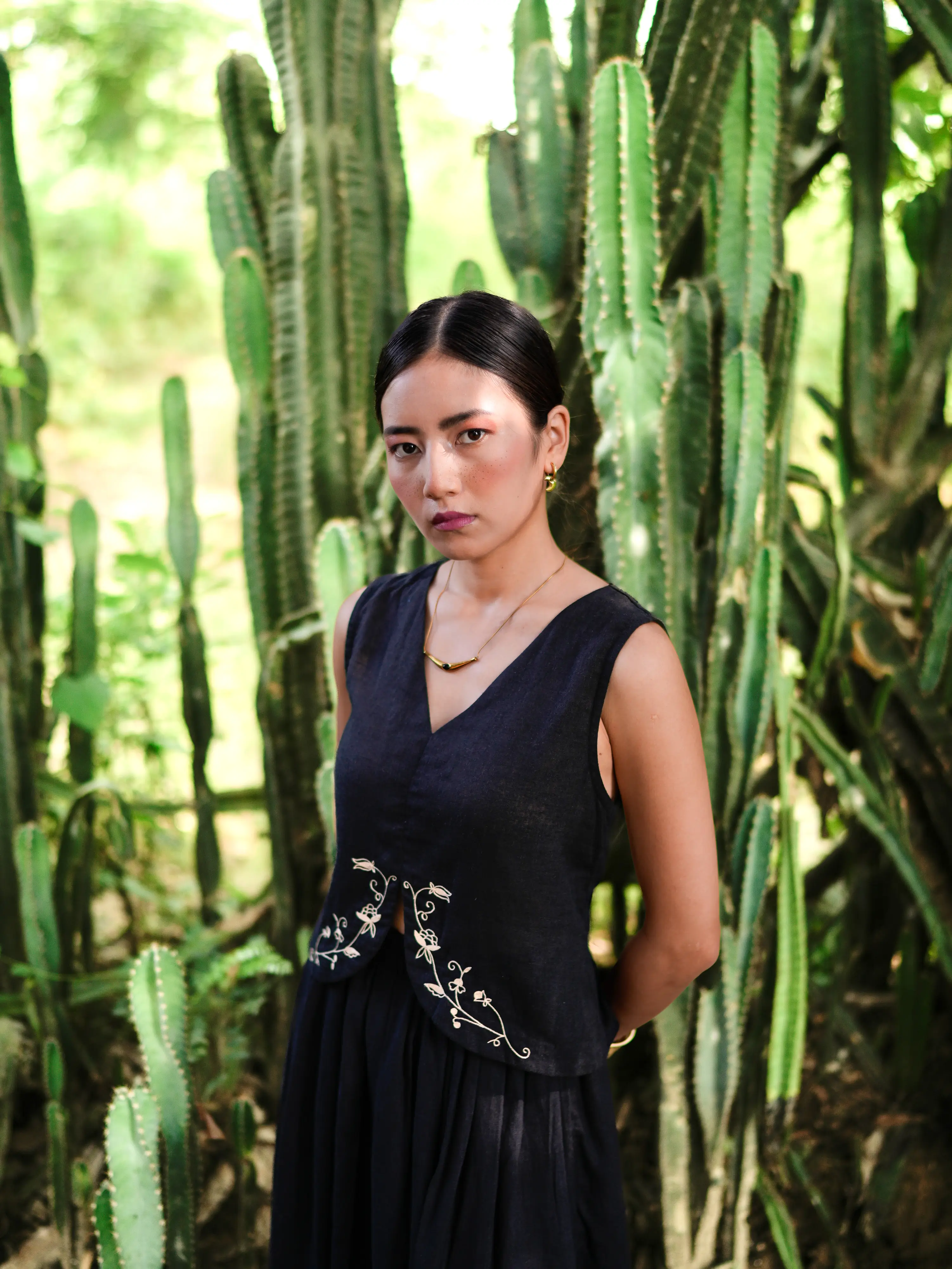 The Alba top is crafted from linen fabric and features a floral hand-embroidered detail on the front, along with a feminine V-neckline. It has an adjustable drawstring back, allowing for a customized fit.