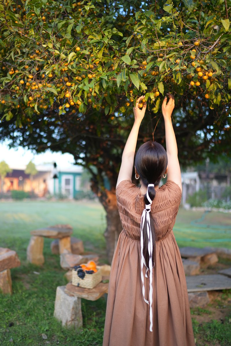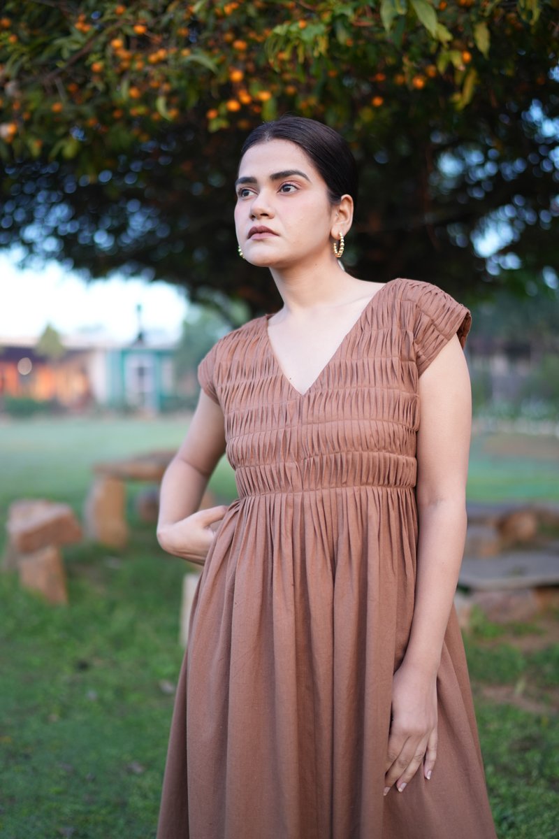 Elora features intricate hand-smocked detailing on the front and back, adding texture and craftsmanship to the design. The dress has a flared silhouette for a flowy, comfortable fit, with side strings to adjust the waist as needed. A lace-insert border at the hem enhances the overall detail, making it a versatile and elegant choice