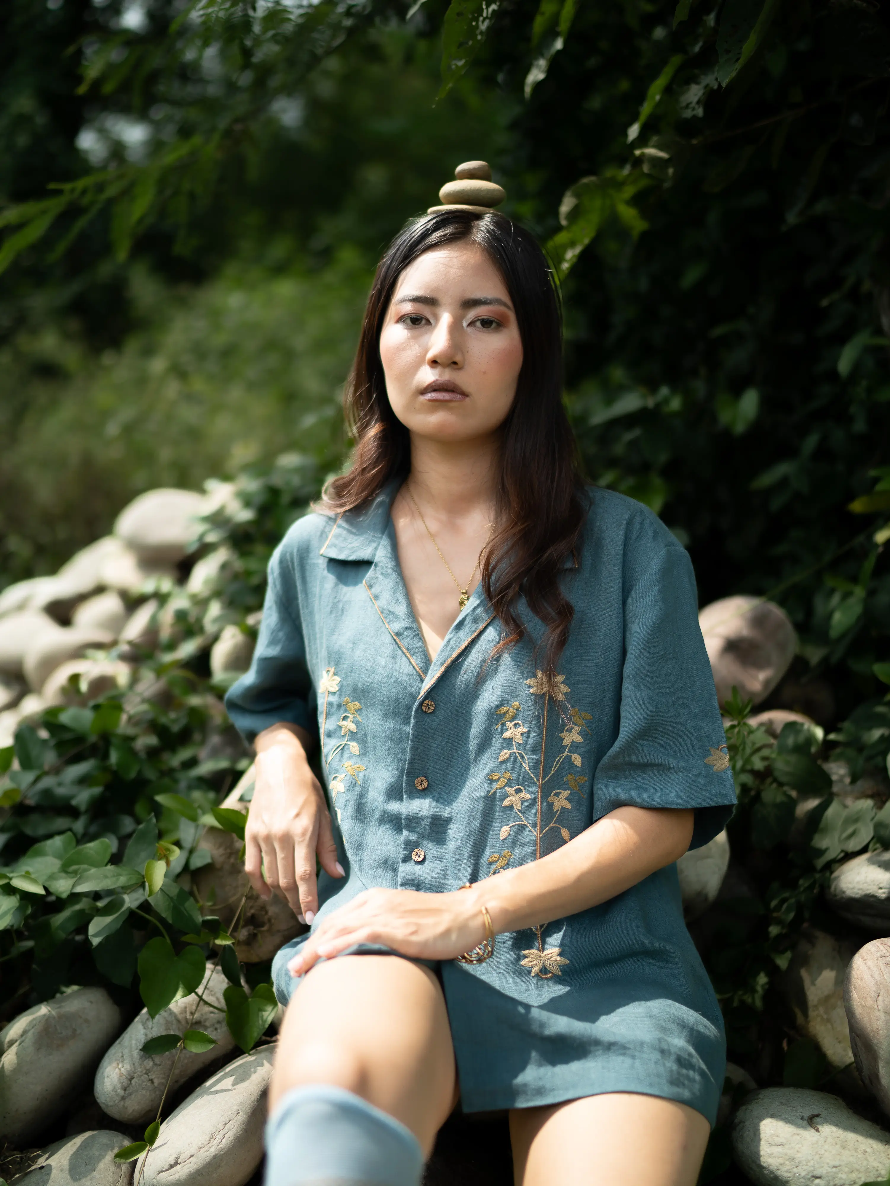 Delicate hand-embroidered nature inspired motifs add an artisanal touch, making it a versatile piece that pairs effortlessly with both tailored bottoms and casual separates.