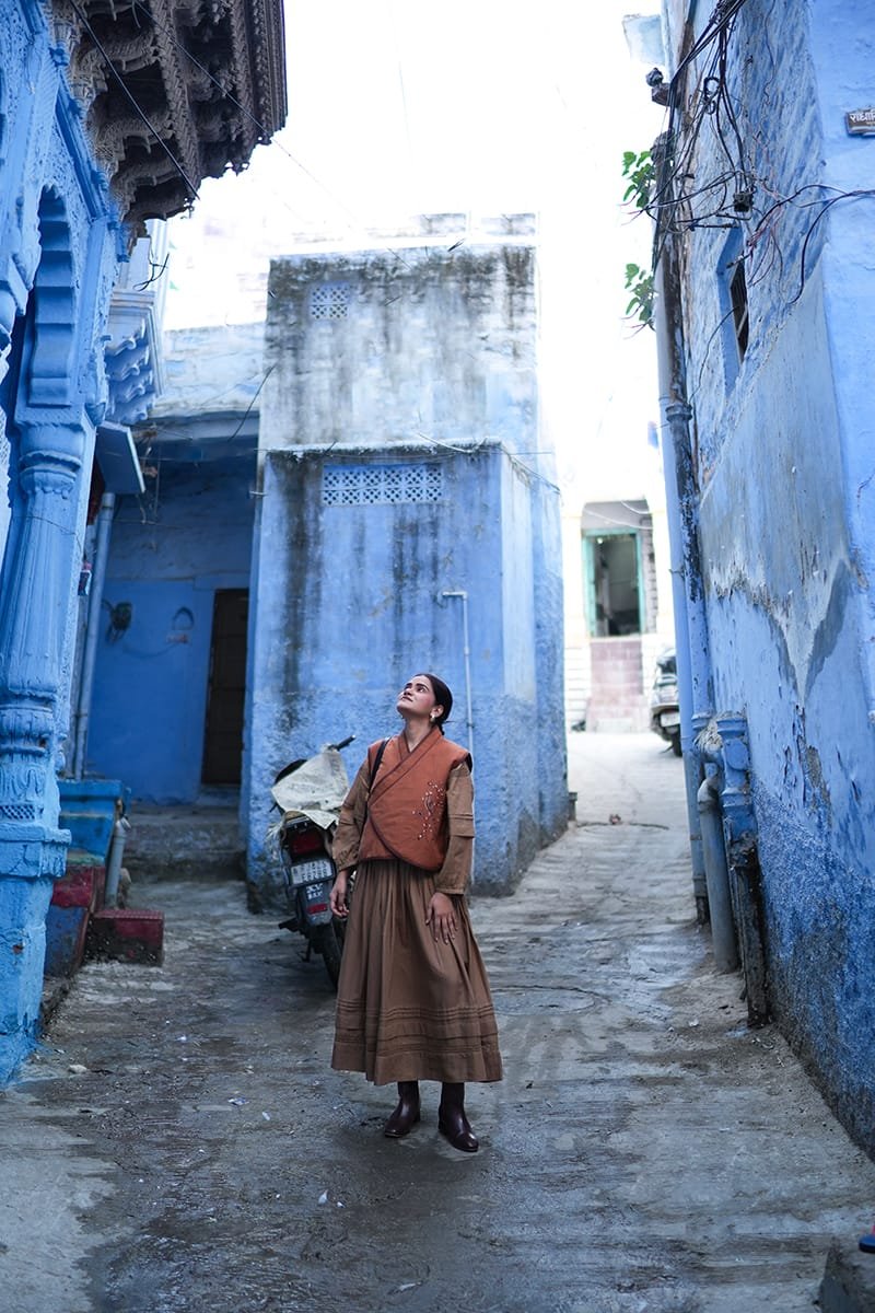 The Loom jacket, featuring a quilted style made in linen fabric, showcases a wrap silhouette and hand-embroidered appliqué work. It is paired with our Isabella skirt and Valentina blouson in a custom mocha color.