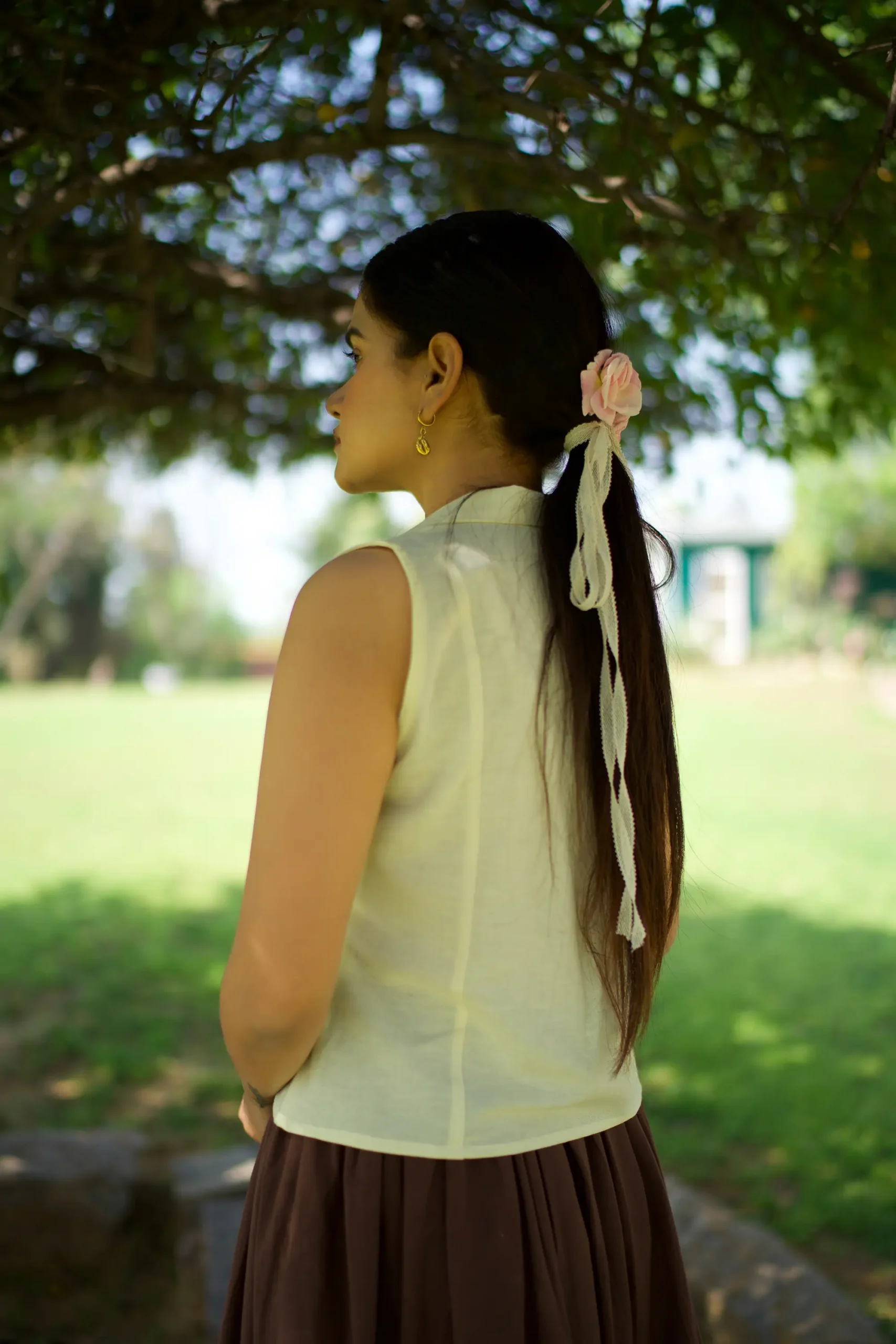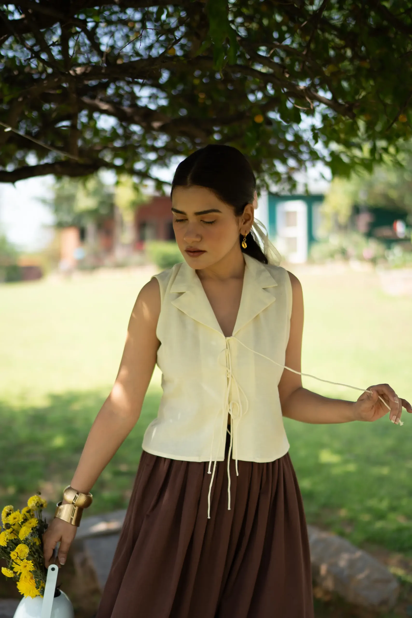 The Lumi Top is made from soft, breathable linen. It features a notch collar neckline with a tie detail at the front, adding a refined touch.