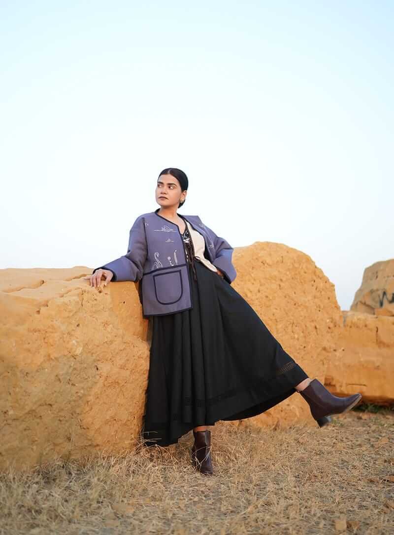 Mist hand-embroidered quilted jacket. It features beautiful nature embroidery work on both sides at front, it has a open front style made in heavy weight linen fabric