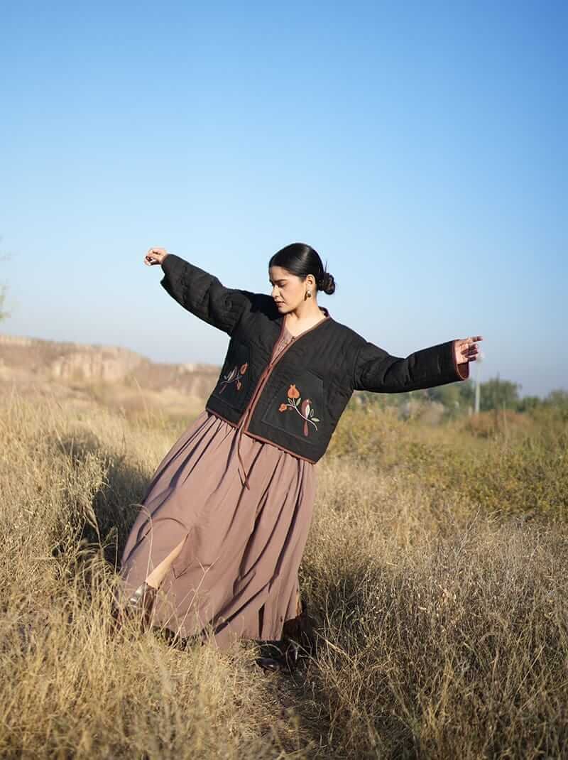 Muse appliqué hand-embroidered quilted jacket. It features beautiful appliqué work on both sides and a front tie-up detail