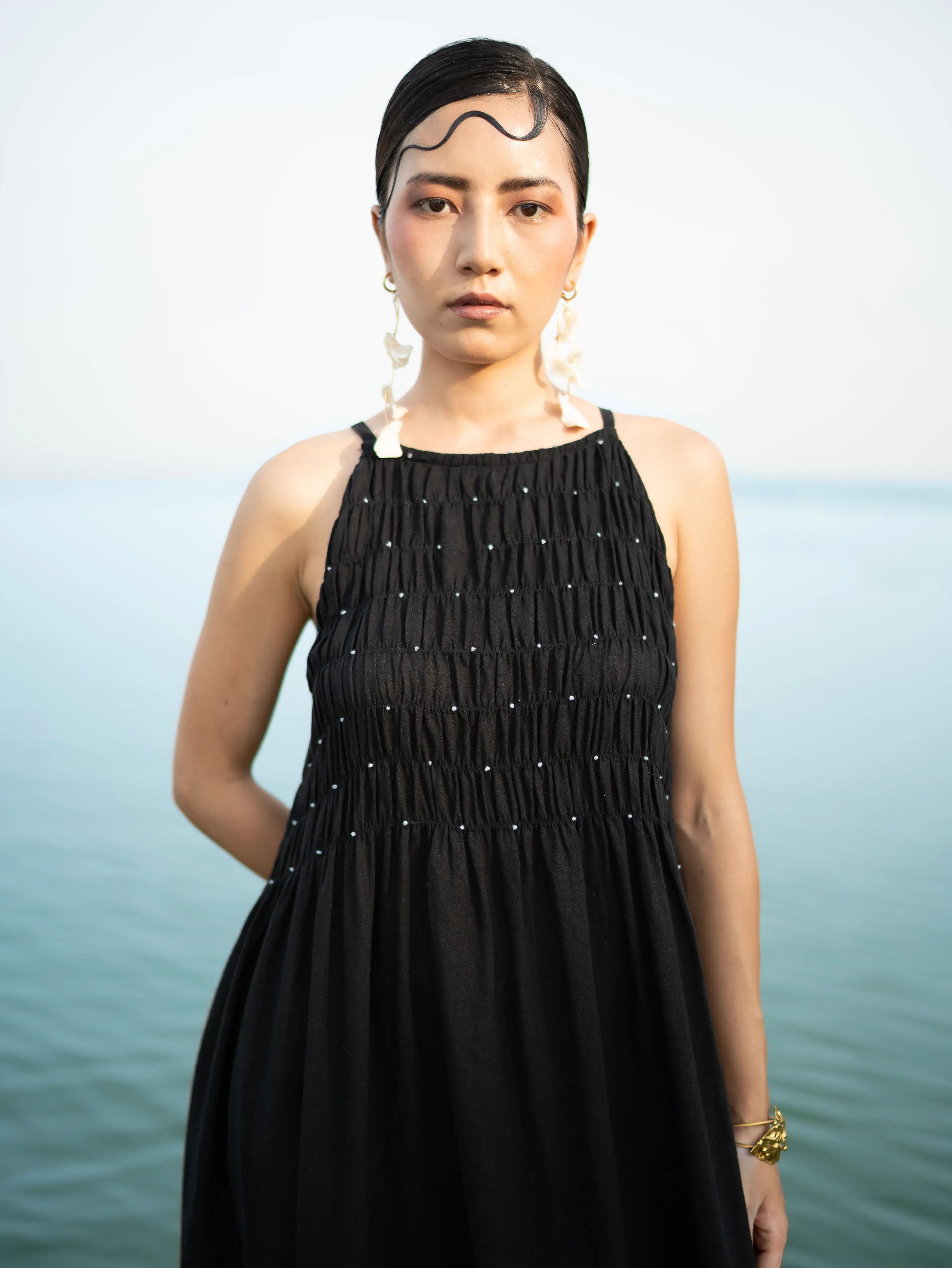 In soft, flowy black linen, this A-line piece sits gracefully below the waist, featuring smocked detailing at the front and back for a flattering fit. Hand-embroidered knots adorn the top, while delicate floral motifs, lace, and pleats accent the hem for an artisanal finish.
