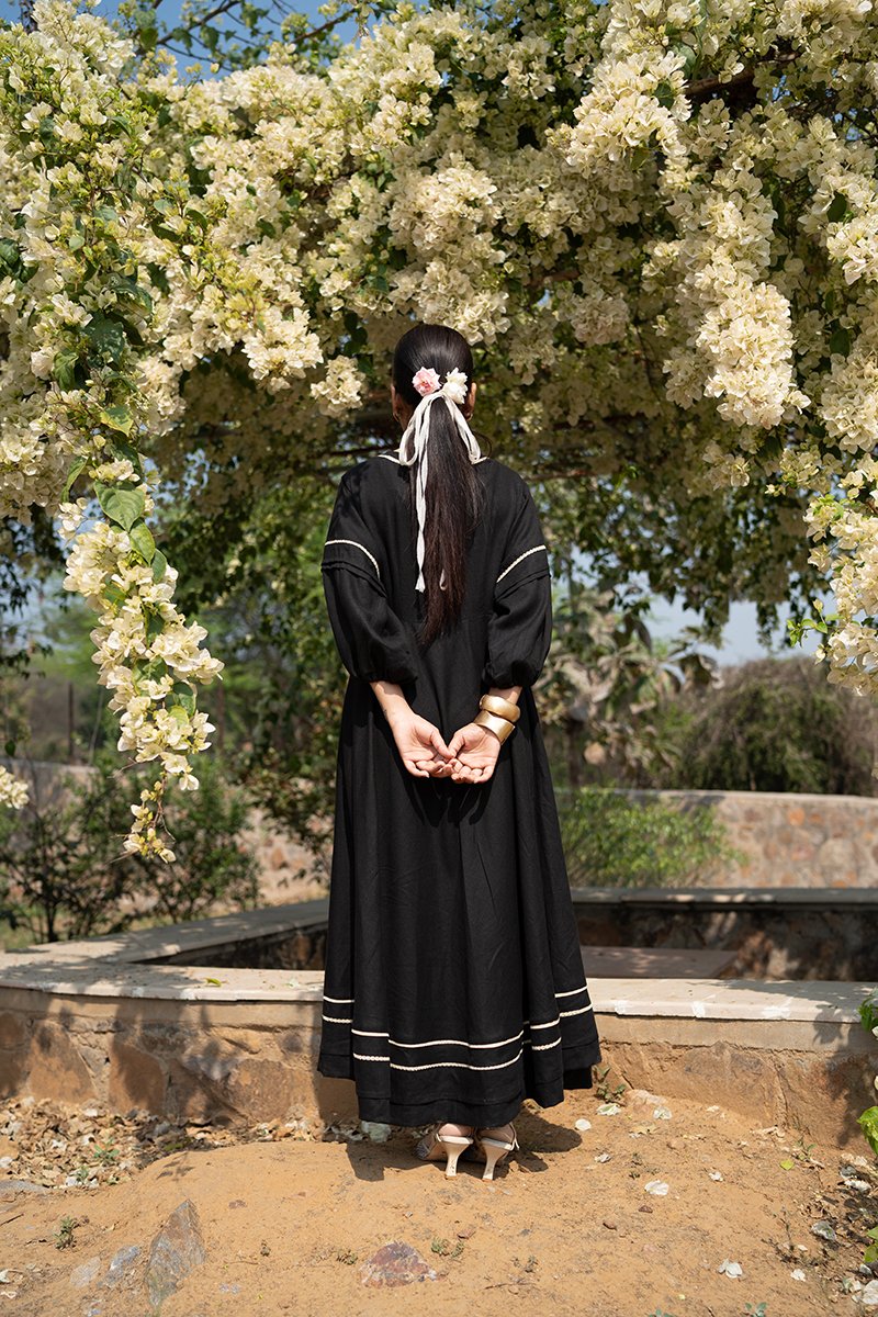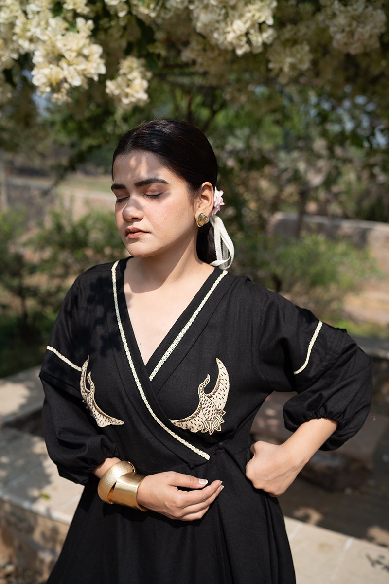 The Noira dress features a wrap-style silhouette with an appliqué motif at the front. Crafted from linen, it is designed with delicate lace insert details, a collared neckline, and a flared bottom for an effortless, elegant look.