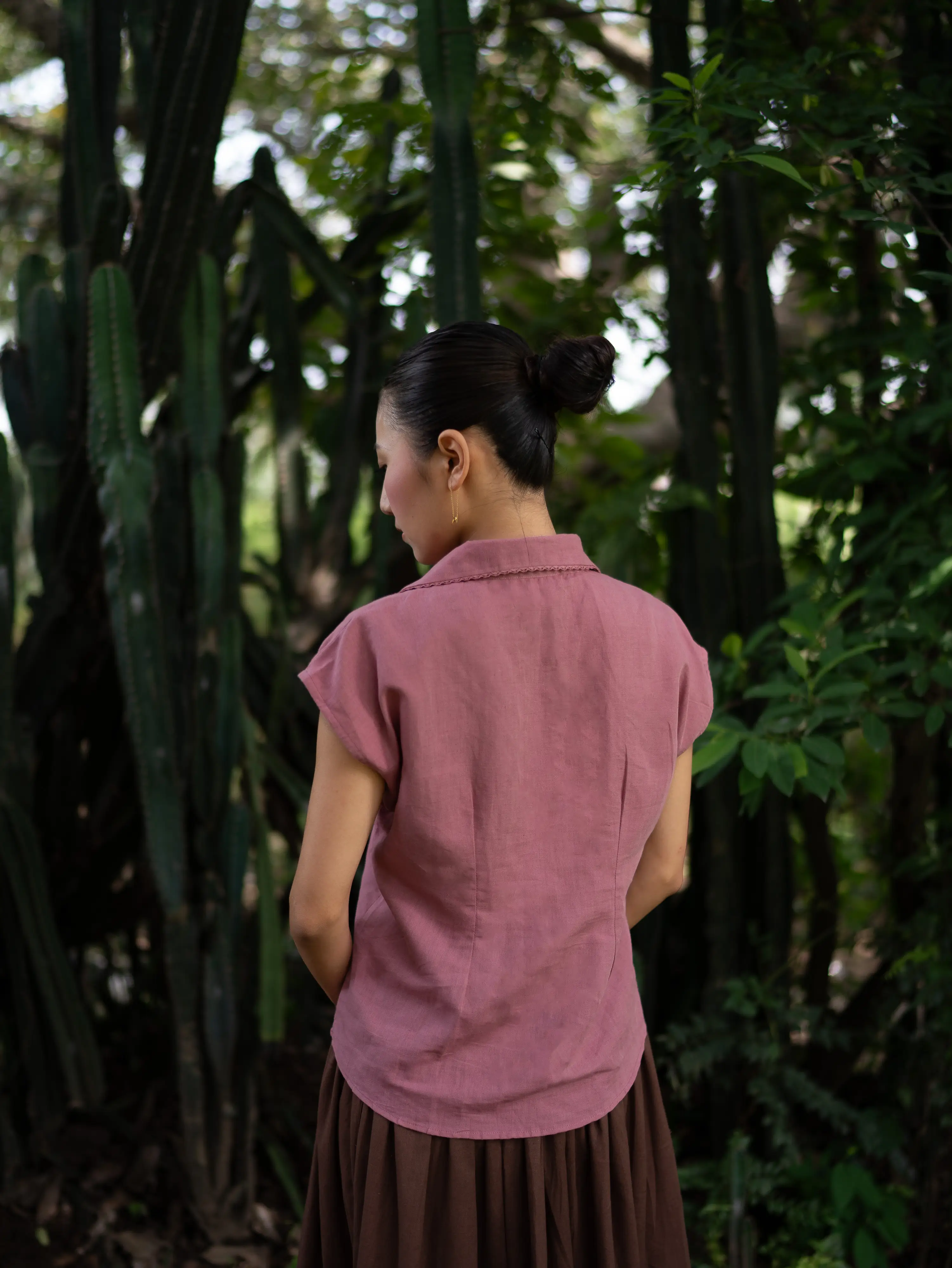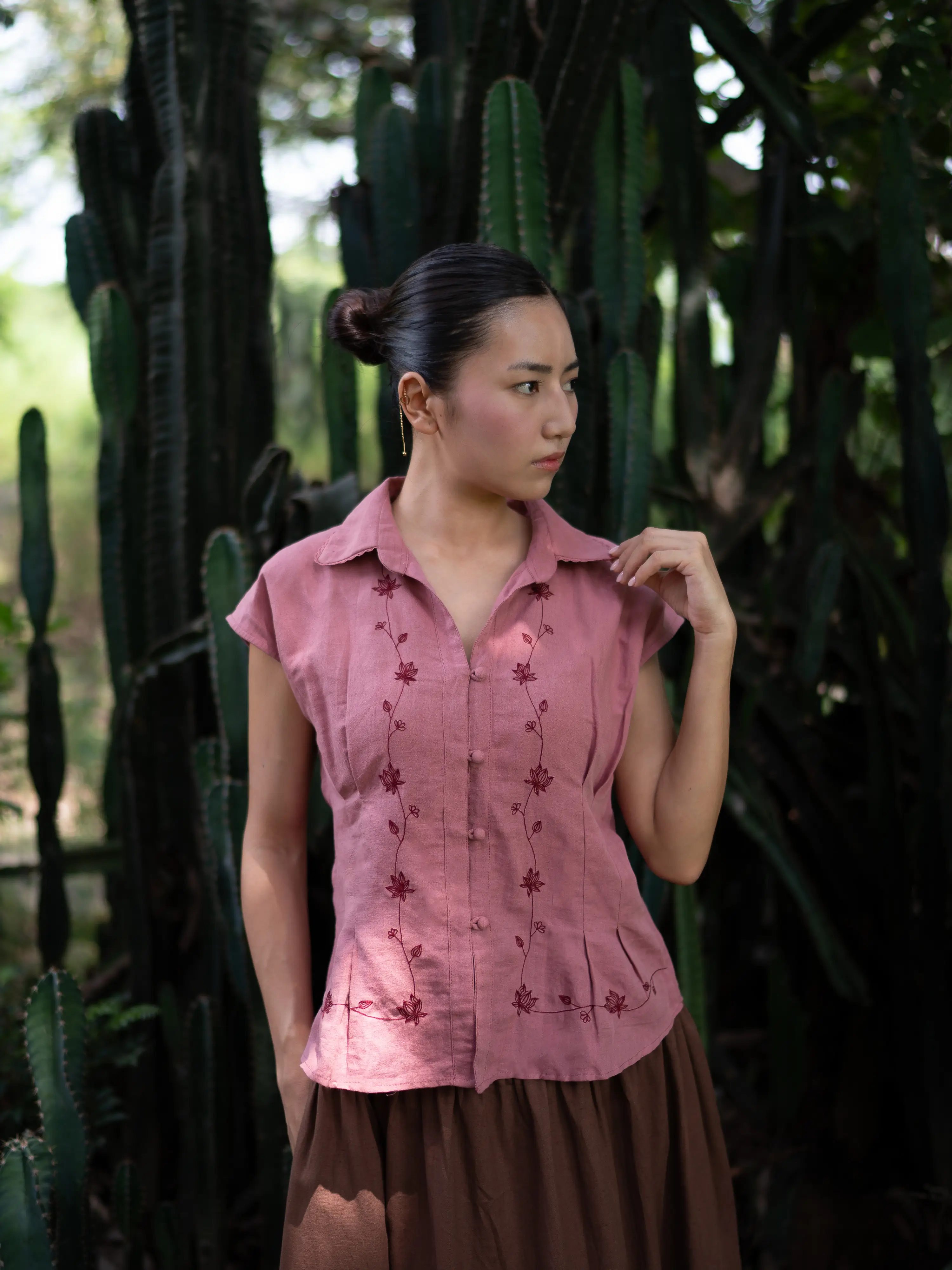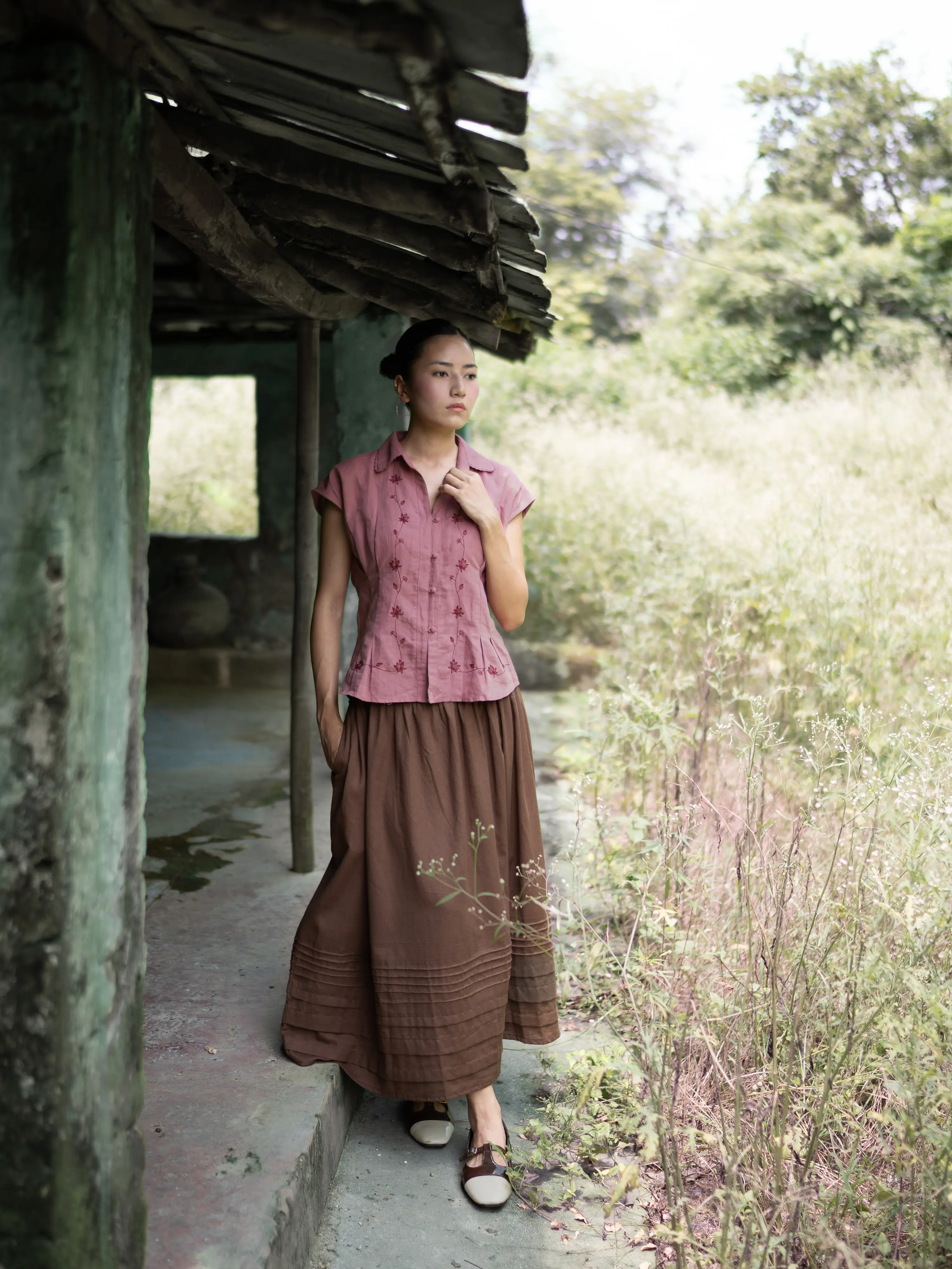 This soft pink linen top features a collared neckline with delicate hand-embroidered detailing and front pleats at the waist for a subtly tailored fit. Paired with a rich mocha brown skirt, it offers an elegant balance of structure and ease. Style with nude heels for a polished brunch look or woven flats for a relaxed day out โ a versatile piece that moves effortlessly from casual to refined occasions.