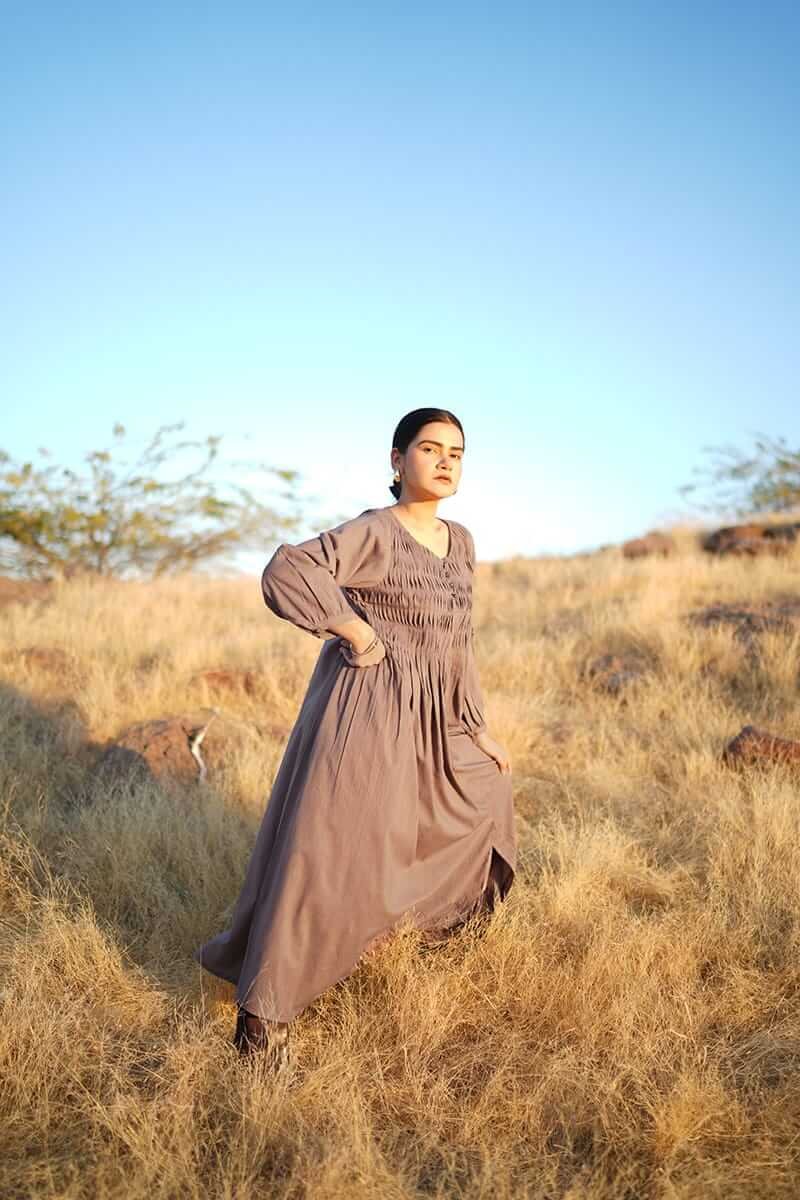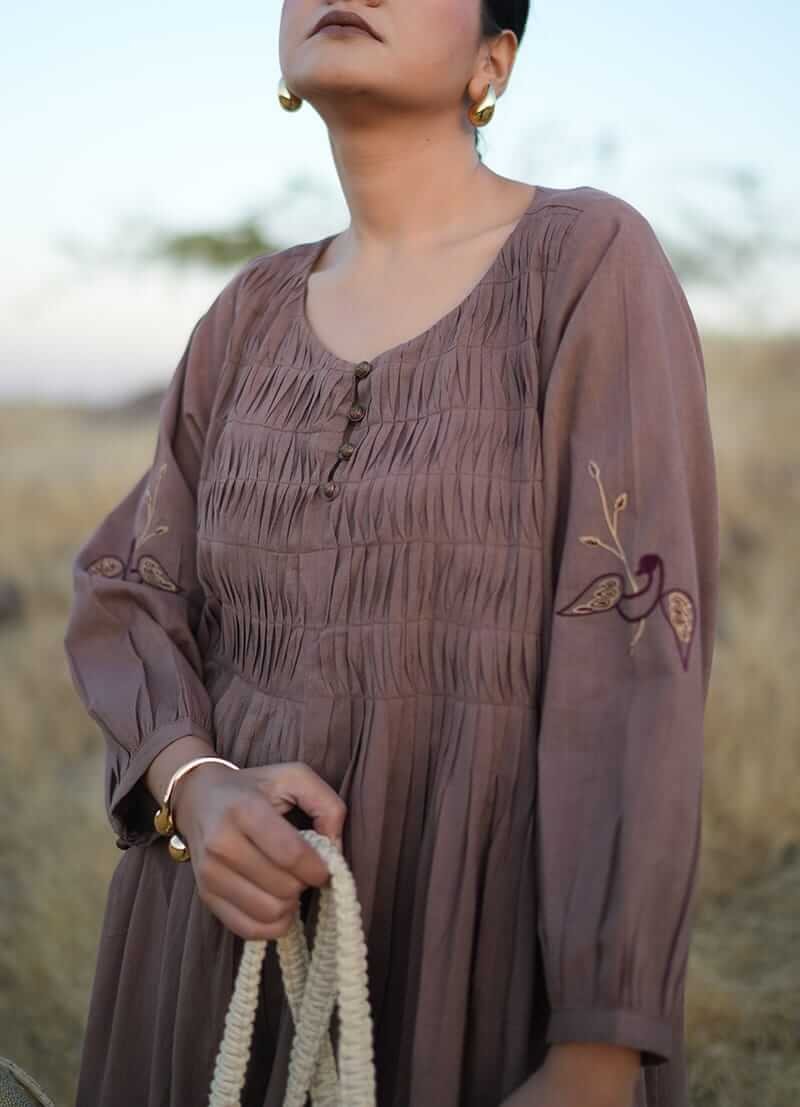 The Plume dress features a hand-smocked detailed front and a relaxed silhouette. It is adorned with a hand-embroidered peacock motif on the sleeves. Pair it with boots, and you’re ready for a brunch party or the perfect travel OOTD