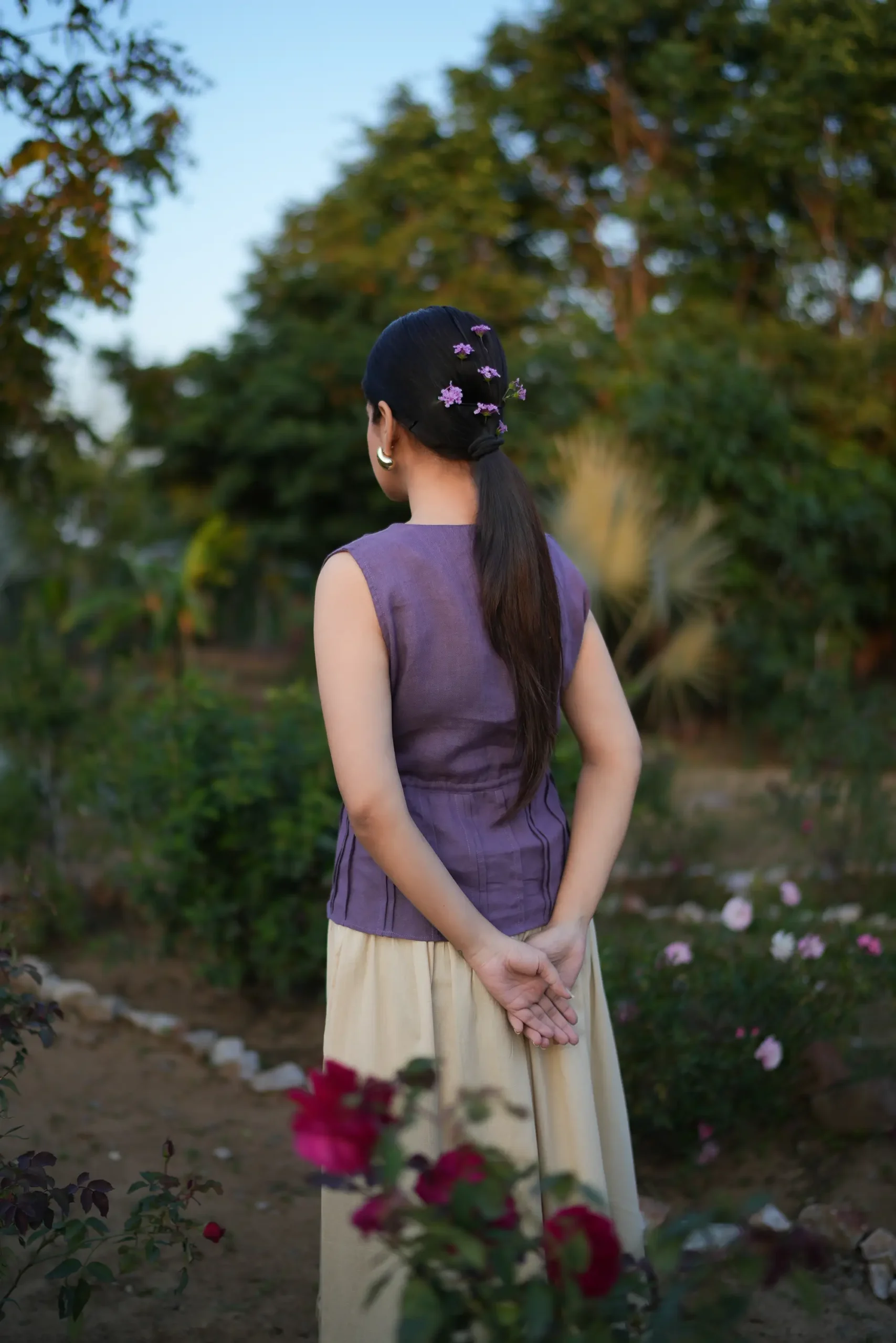 The Primrose top is made from soft, breathable linen. It features hand embroidery work at the neckline and a tie detail at the waist to adjust the fit as needed.