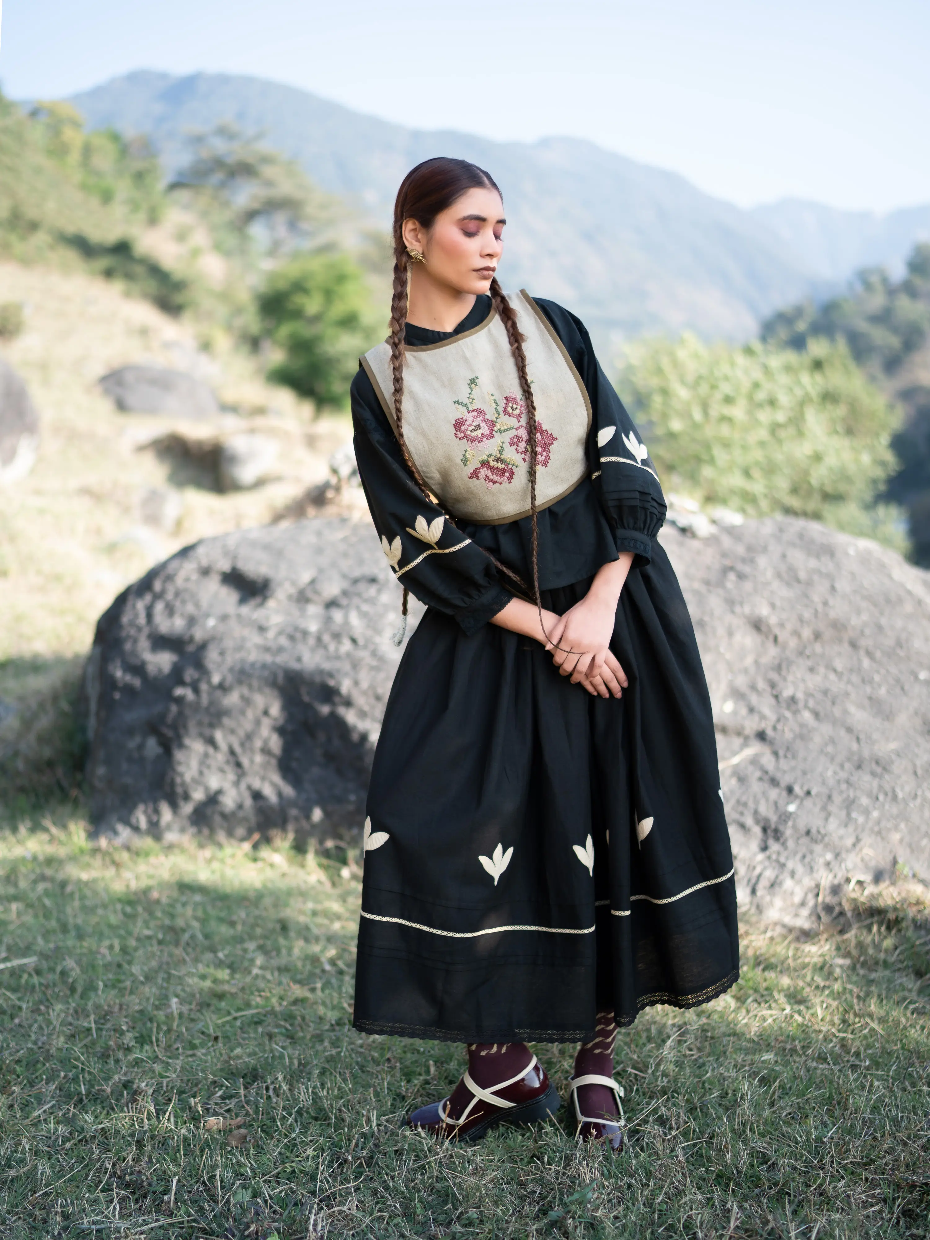 Featuring a flower bouquet motif hand done by hundreds of cross stitches, this overlay tie up piece is perfect to style it with your cords.