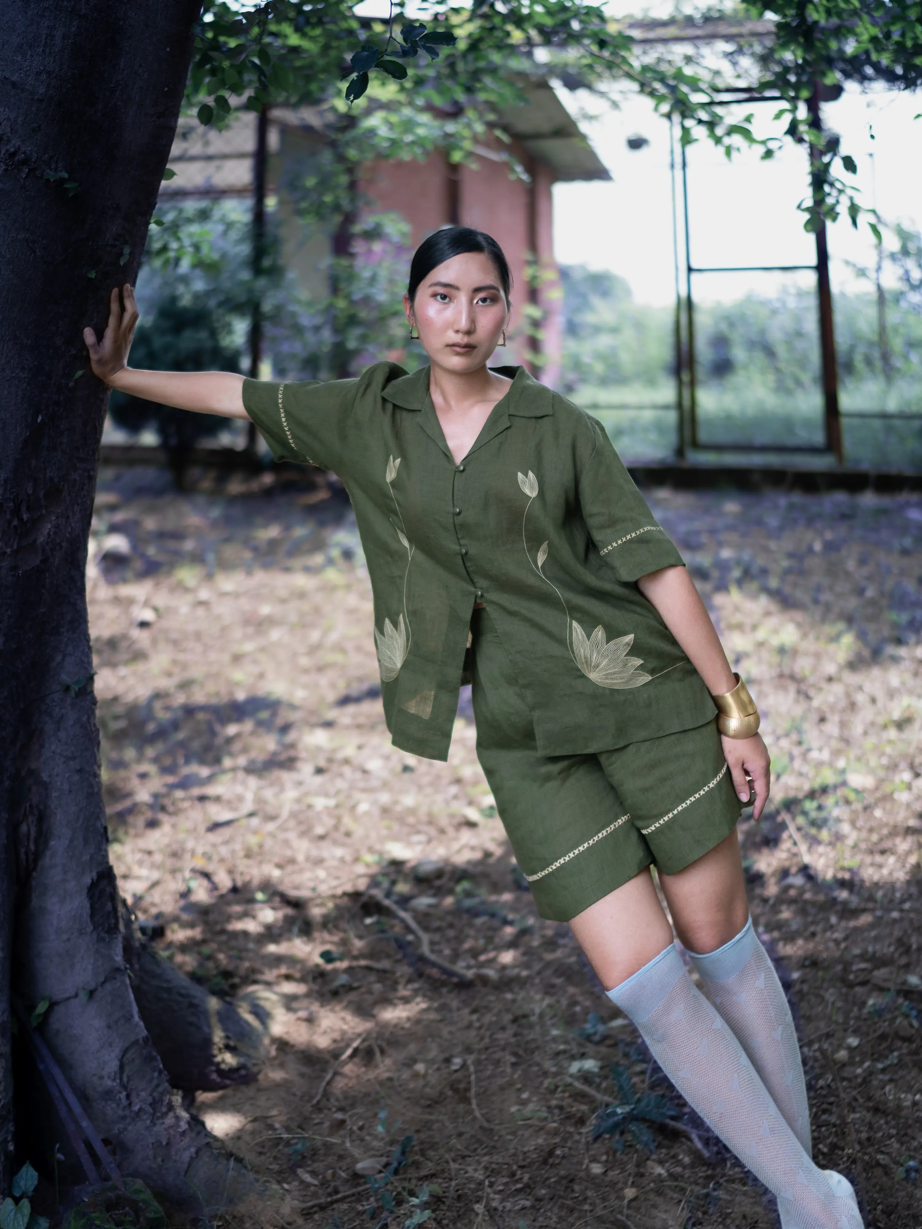 These linen shorts feature a relaxed fit with a clean front, back elasticated waistband, and a front zipper for ease. Delicate hand embroidery along the hem and soft front pleats add both comfort and character.