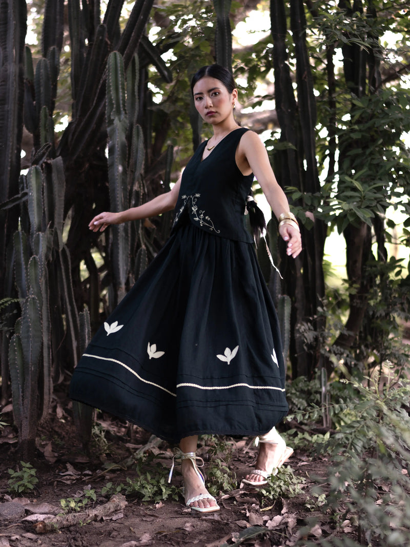 Crafted in breathable linen, this black skirt features intricate appliqué and lace details at the hem. With soft pleats, a comfortable elasticated waist, and a full flared silhouette, it blends artisanal charm with effortless wearability.