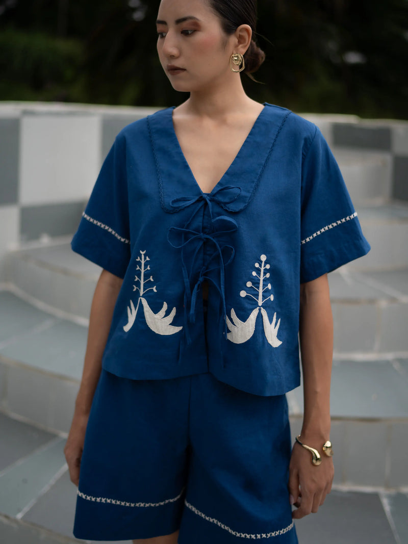 This cotton-linen shirt style top features a front tie detail that adds playful charm to its boxy fit. The front is elevated with intricate appliqué work, bringing texture and artistry to the design. Light, breathable, and statement-worthy, it’s perfect for days you want comfort without compromising style.